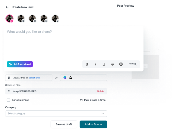 Flowxtra’s built-in AI Assistant helps you craft engaging posts, generate creative captions, and adapt your tone for every platform — whether it’s LinkedIn, Instagram, TikTok, or X.